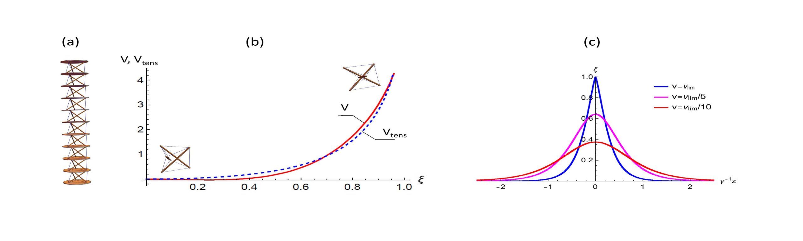 The first video that follows describes the post-tensioning of 3D-printed tensegrity columns manufactured in the Ti6Al4V titanium alloy with Spectra fibers (see READ MORE below). A second video illustrates an experiment on the dynamics of a tensegrity column impacted by a striker. Ref.; Frontiers | On the Mechanical Modeling of Tensegrity Columns Subject to Impact Loading (frontiersin.org)). The picture underneat such a video describes the results of an analytic study on the profiles of compression solitary waves traveling in tensegrity lattices: (a) Tensegrity mass-spring chain. (b) Fitting of the tensegrity potential (blue-dashed curve) with a tensegrity-like potential (red-solid curve). (c) Strain wave profiles in tensegrity-like chains for different wave-speeds. Ref. https://doi.org/10.1016/j.ijnonlinmec.2022.104264.