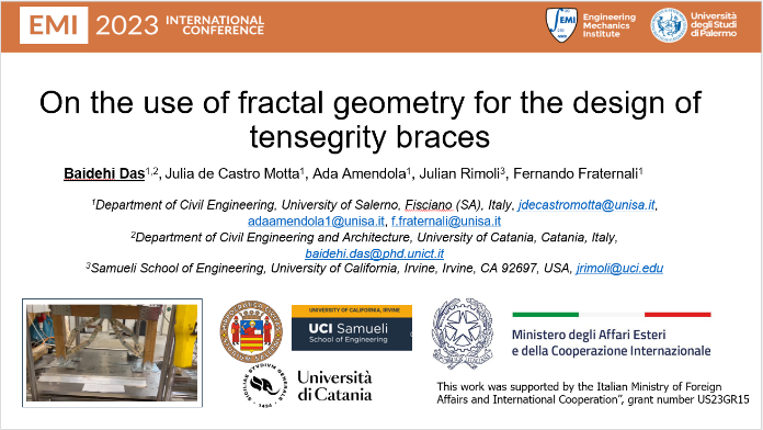 Le dottorande Valentina Adinolfi (UNISA) e Baidehi Das (UNICT, UNISA) hanno presentato i loro progetti alla EMI Conference 2023. Valentina Adinolfi ha presentato uno studio dal titolo “A multiscale approach to design of seismic metaisolators”, mentre Baidehi Das ha fatto la sua presentazione “On the use of fractal geometry for the design of tensegrity braces”.