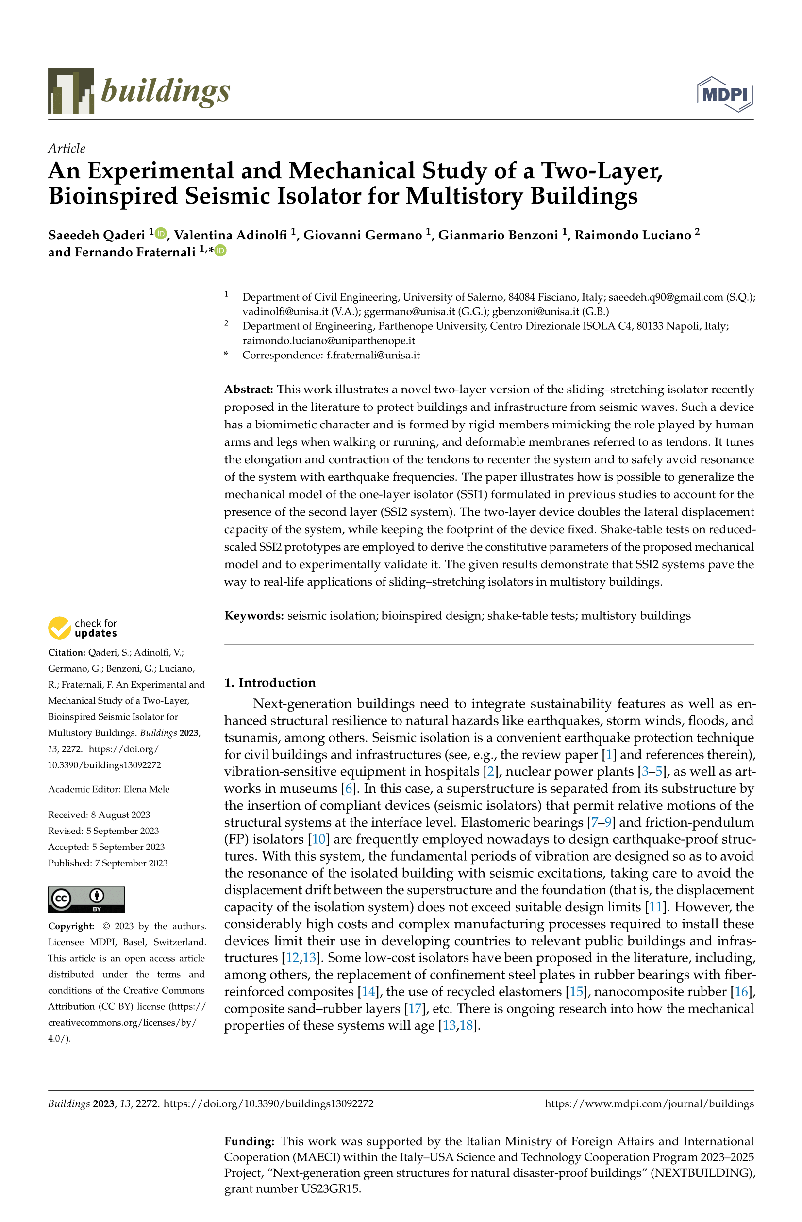 • QADERI, S.; ADINOLFI, V.; GERMANO, G.; BENZONI, G.; LUCIANO, R.; FRATERNALI, F. An Experimental and Mechanical Study of a Two-Layer, Bioinspired Seismic Isolator for Multistory Buildings. BUILDINGS. 2023; 13(9):2272.