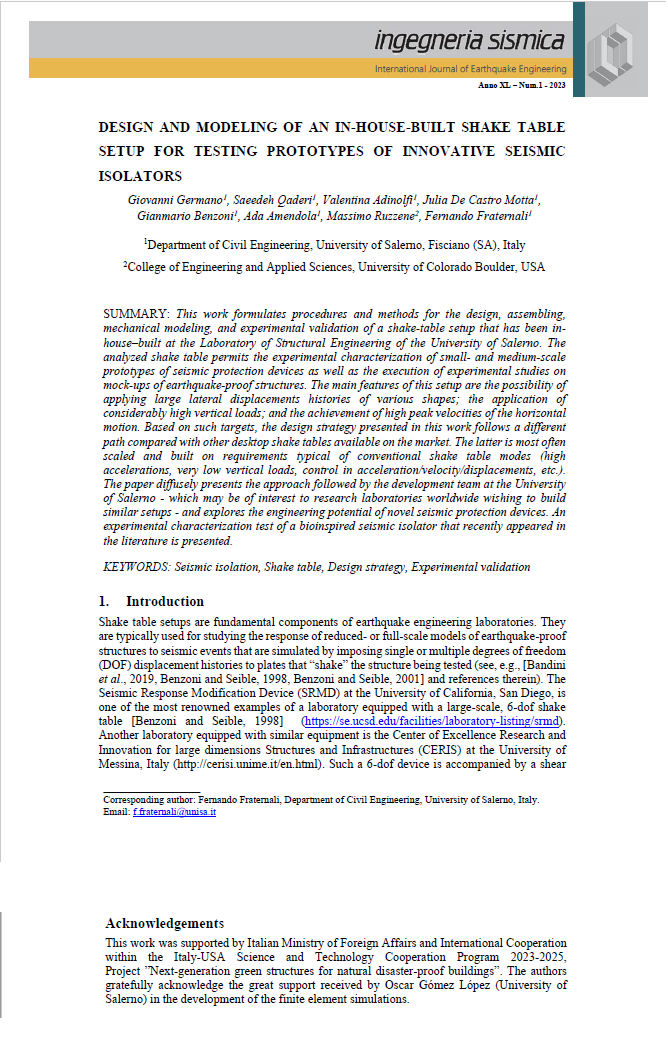• GERMANO, G., QADERI, S., ADINOLFI, V., DE CASTRO MOTTA, J., BENZONI, G., AMENDOLA, A., RUZZENE, M., FRATERNALI, F. Design and modeling of an in-house-built shake table setup for testing prototypes of innovative seismic isolators INGEGNERIA SISMICA/INTERNATIONAL JOURNAL OF EARTHQUAKE ENGINEERING, 40(1), 58-73, 2023.