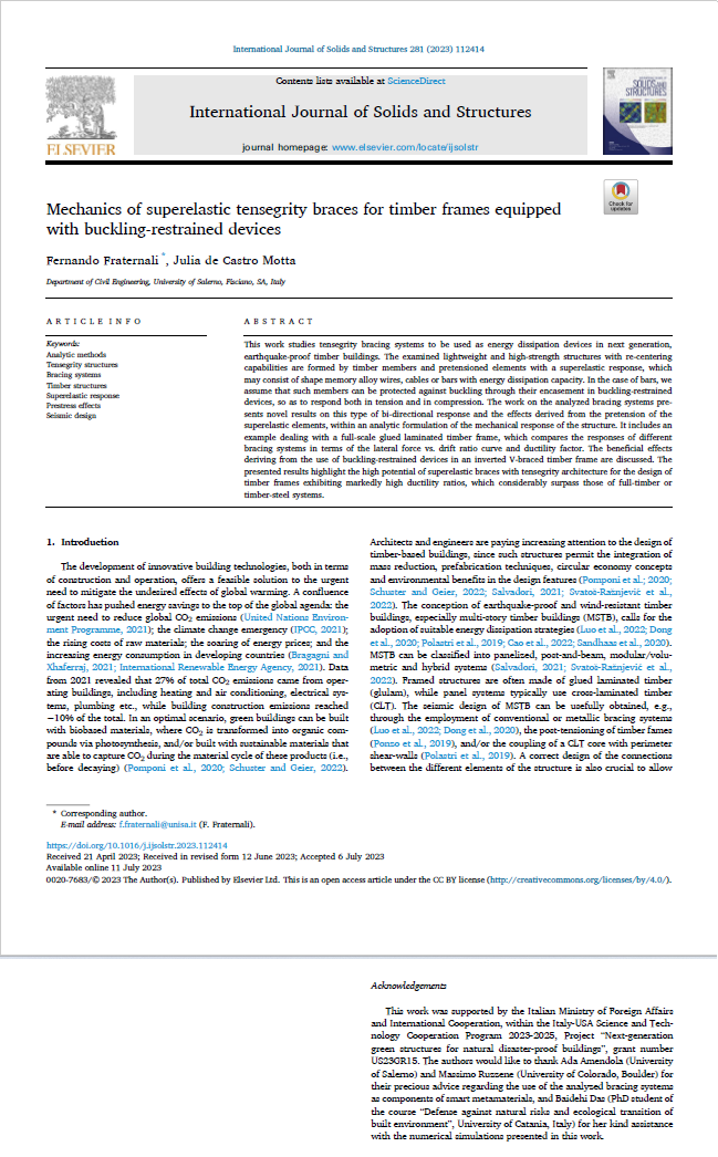 • FRATERNALI, F.; DE CASTRO MOTTA, J. Mechanics of superelastic tensegrity braces for timber frames equipped with buckling-restrained devices. INTERNATIONAL JOURNAL OF SOLIDS AND STRUCTURES, 281: 112414,2023.