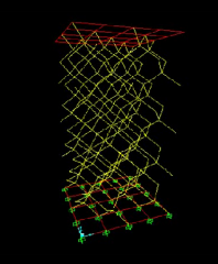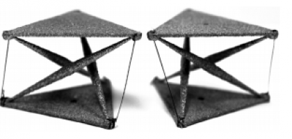 A modeling research line of this researchwill study the effects of internal and external prestress on nonlinear lattice mechanics, with the aim of designing arbitrary lattice behaviors. Material-scale applications of multiscale lattices will deal with novel dynamic devices and hierarchical composite materials. A structure-scale application will exploit lattices with morphing abilities to design adaptable envelopes for energy efficient buildings The present research line will lead to the computational design, modeling, and fabrication of new materials and structures, using innovative concepts. Use will be made of 3D printing technologies such as multiscale additive manufacturing of tensegrity structures through electron beam melting, laser lithography and/or projection micro-stereolithography. Particularly interesting is the use of 3D micro-fabrication technologies for the manufacturing of miniaturized tensegrity structures. Such a technology could be used as a swellable material allowing selected elements to be pretensioned (cables), and a material without swelling for the compressive members (in collaboration with Ferdinando Auricchio at the University of Pavia, link;Chiara Daraio at the ETH, link; Vitali Nesterenko at the UCSD, link; Nicholas Boechler at the University of Washington, link; and Howon Lee at the Rutgers University, link).