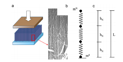 (a) Schematic diagram of a vertically aligned CNT foam, uniformly loaded in compression. (b) SEM of the as-grown carbon nanotube film showing the alignment and the microstructural layering due to the growth process (Deck and Vecchio, 2005). (c) Modeling of a portion of a CNT foam as a collection of microscopic mass-spring elements.